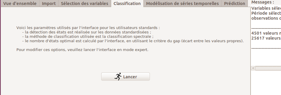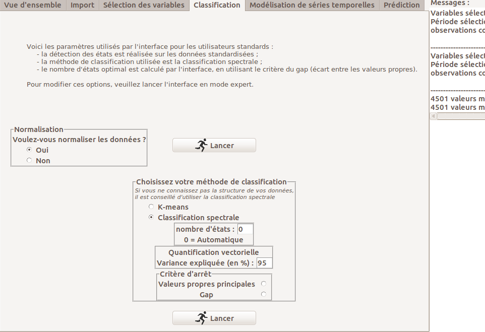 Lorsque l’interface est utilisée en mode standard, il suffit de cliquer sur le bouton "Lancer" pour démarrer la procédure. Dans ce cas, les données sont normalisées et la méthode utilisée est la classification spectrale, avec sélection automatique du nombre d’états en utilisant le critère du gap 1.