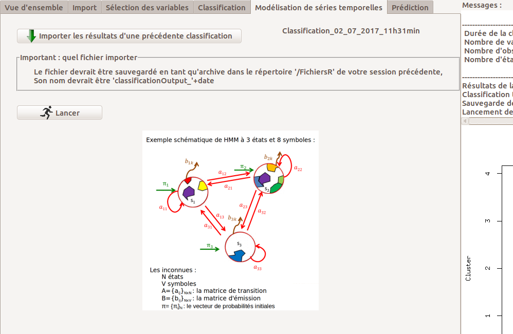 L’onglet "Modélisation de séries temporelles" permet d’estimer5 les paramètres d’un modèle de Markov caché, à partir des états détectés par classification non supervisée.